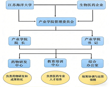 生物医药产业学院在江苏海洋大学党委领导下,按照“管委会领导下的院长负责制”架构起政校企多元化的管理体系,设有管理委员会,成员来自高校、政府、合作企业。管委会主任由江苏海洋大学校长担任,副主任由企业选派高级主管担任。管委会是产业学院的最高领导机构,负责学院改革发展方向、人权、事权、财权重大事项决策,建设科学高效、保障有力的制度体系。
